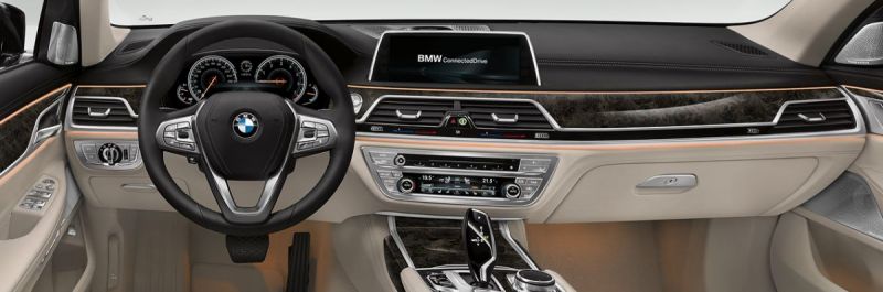 L'habitacle de la Nouvelle BMW Série 7 dispense un confort et un bien être sans égal. Les places arrière offrent une atmosphère unique, des équipements innovants et ne laisse aucun détail au hasard. Des surfaces parfaitement ajustées les unes aux autres et des inserts chromés savamment intégrés au poste de conduite soulignent le souci permanent de qualité. Les éléments de commande du système BMW iDrive Touch s'ornent également d'inserts décoratifs en bois précieux ou en aluminium fonement brossé garants d'une esthétique raffinée. La perfectiont-telle est la source d'inspiration de la Nouvelle BMW Série 7.